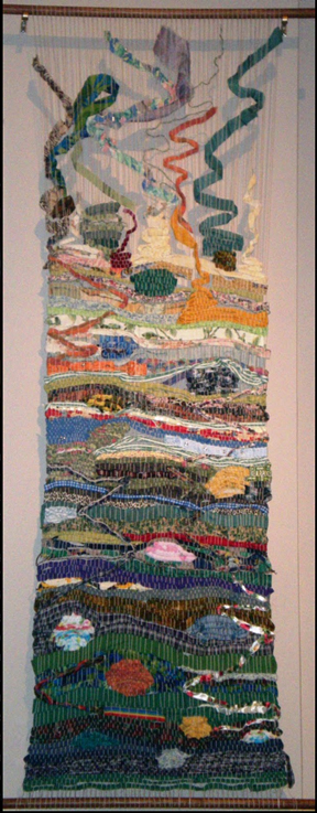 Molly Elkind is an artist who works with fibers. She says, “I love the tactility of it – the texture of those materials in my hands. I love the repetitive process of stitching, weaving or papermaking. I also love making larger works from lots of many small pieces.”