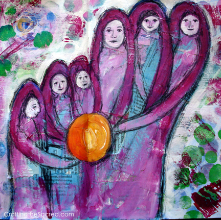 It was during this time that Jo birthed her business, Crafting the Sacred, and recommitted to her creative passions of visual journaling, fiber and mixed media arts. She is currently working on the themes of Art as a Sacred Expression; Home and Belonging; and Fertility and Birth.