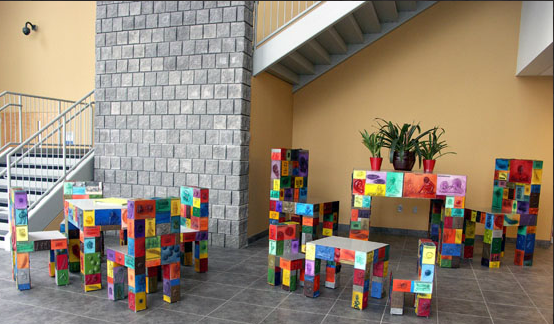 Equilibrium, Fulton County Juvenile Court Facility, Atlanta, GA – 2002: 158 colorful reliefs in the lobby of the new Juvenile Court building were commissioned as a part of the Fulton County Arts Council’s Art in Public Places. Martin held a summer workshop with children from the Juvenile Court to develop imagery for the reliefs. On the west wall, the reliefs are arranged in an abstract pattern and on the east wall, the same reliefs come together to form two 22’ dancing figures of children.